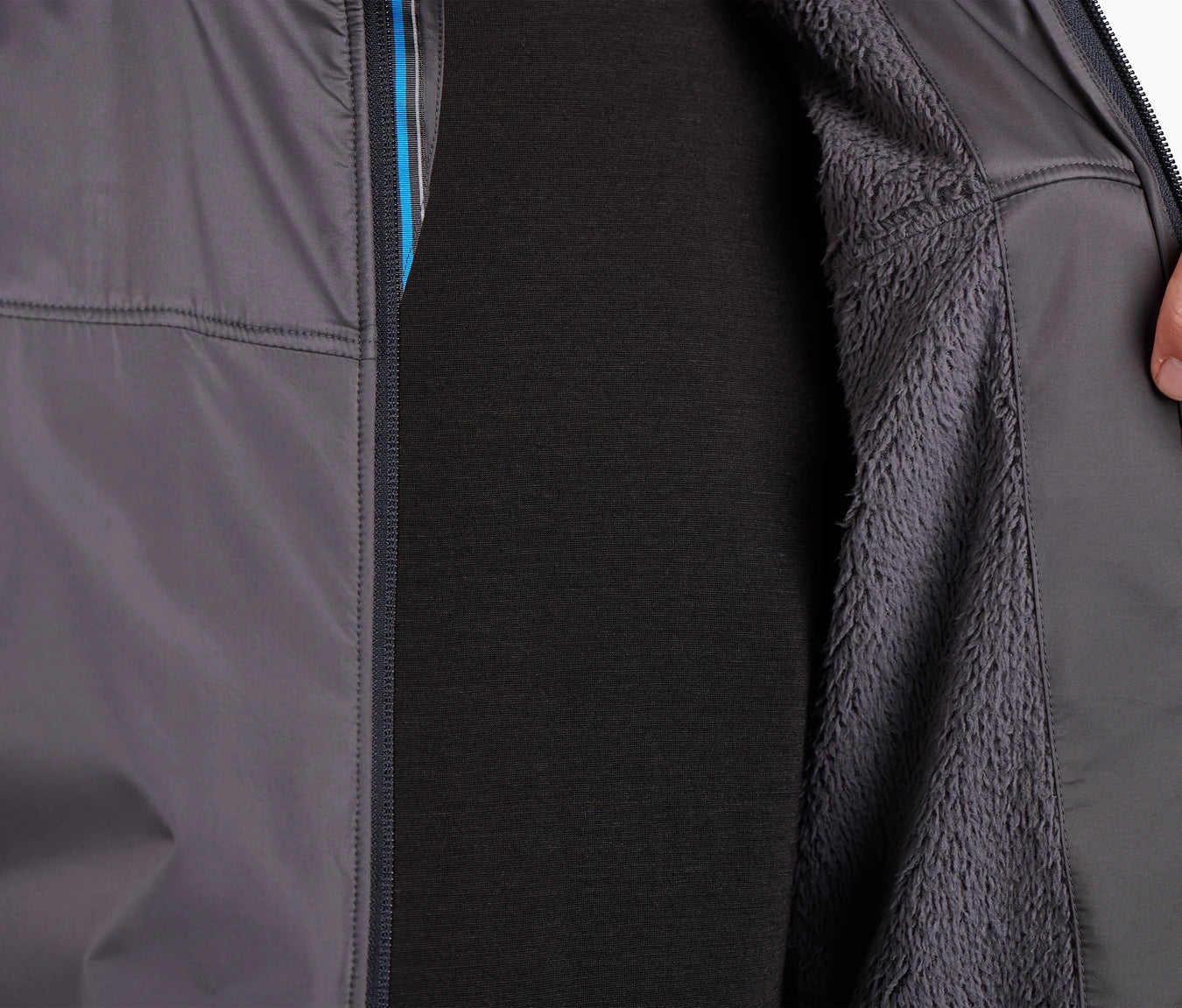 Close up of an unzipped dark gray jacket showing a fluffy lining