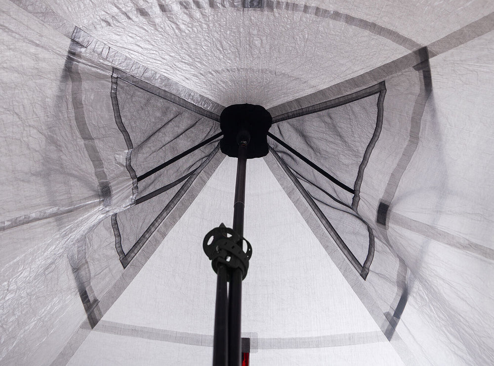 NOTE. The sharp ends of the trekking poles should always be covered with tips. Or you can put a soft cloth / equipment under the sharp end of the pole. Do not insert the sharp ends of sticks or posts into the top of the shelter. The sharp ends of the trekking poles should always be insulated to avoid breaking the top of the PyraOmm.
