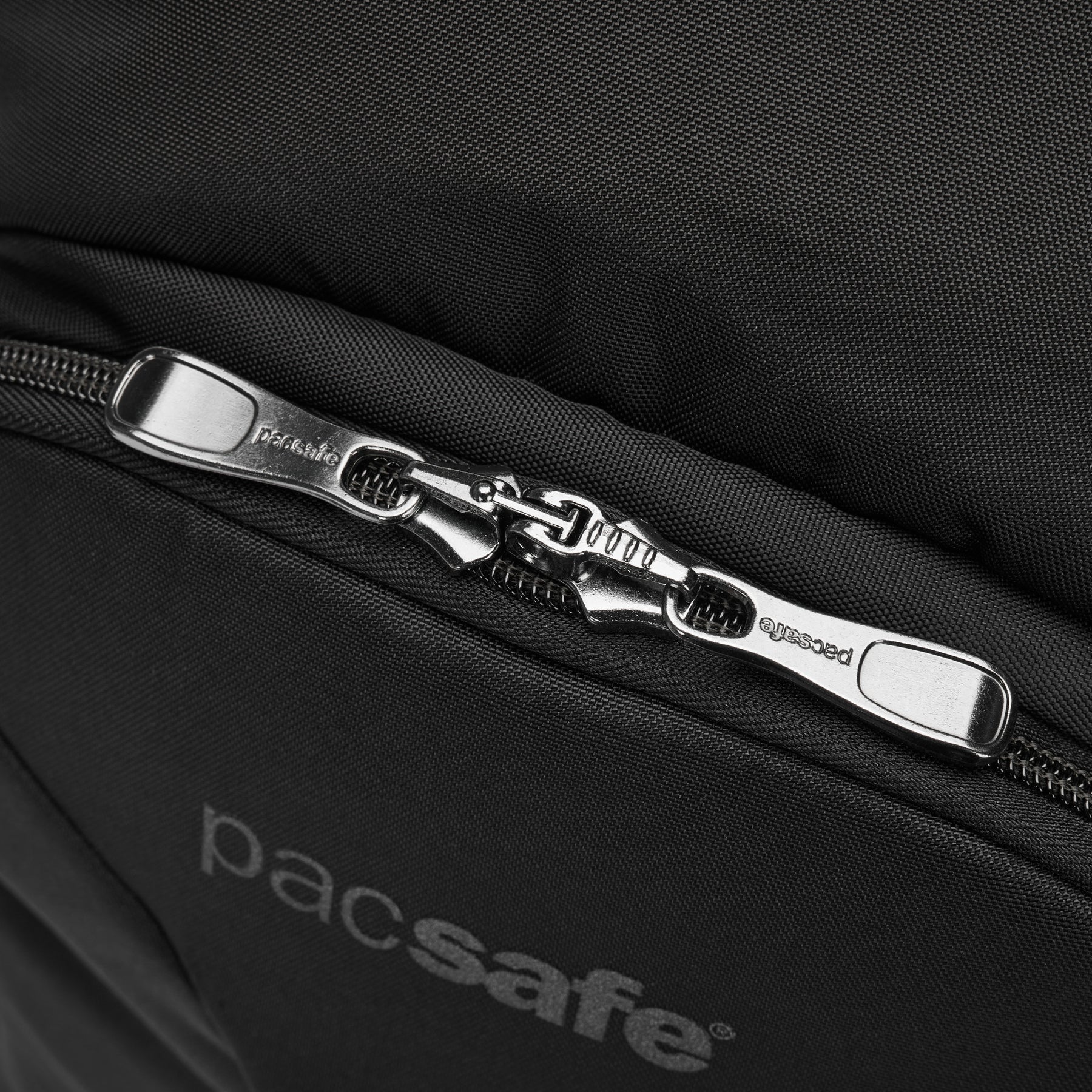 Close up of a lockable zipper at the top of a black Pacsafe branded backpack